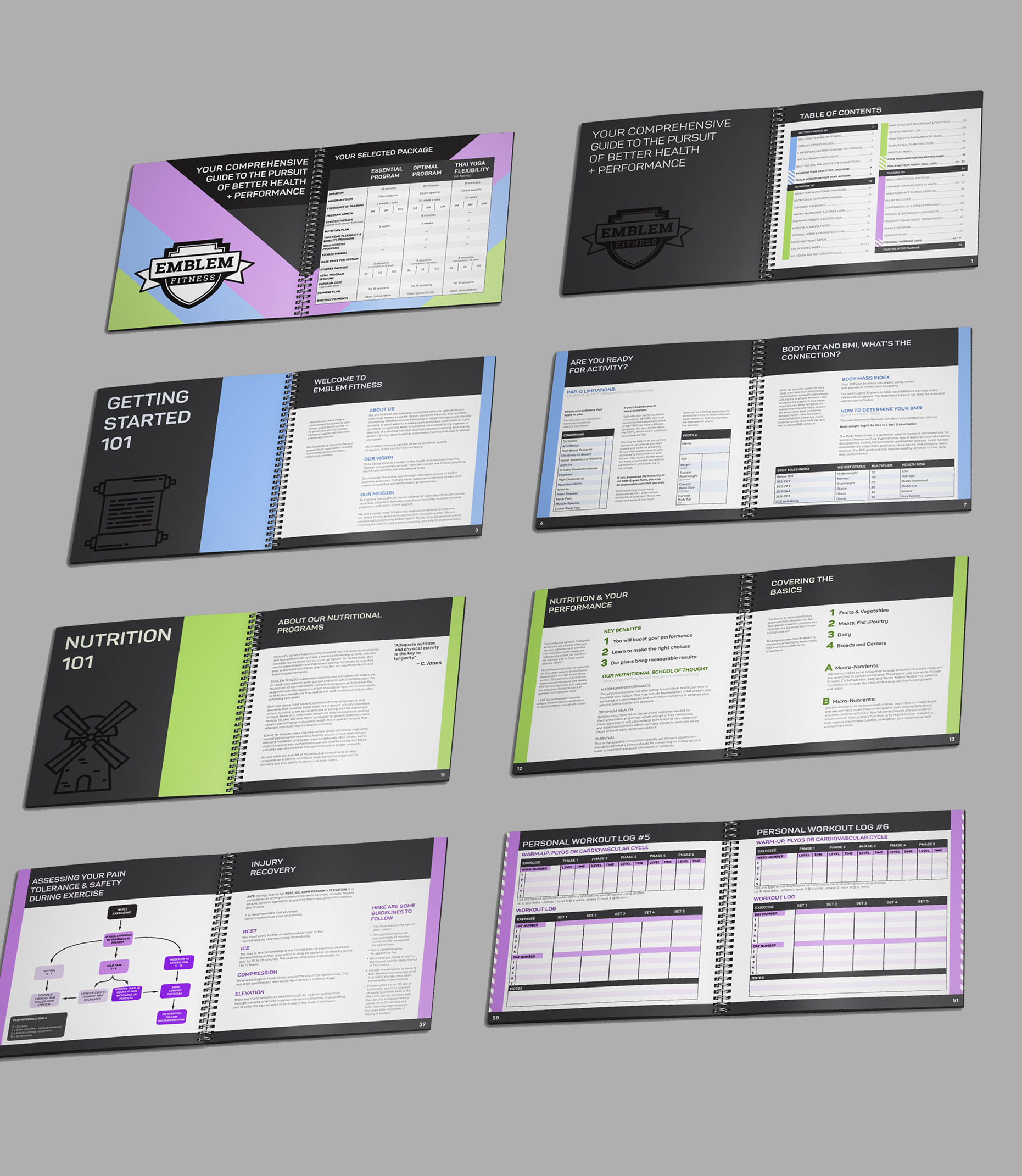 I also invented the name Emblem Fitness and designed its logo, fleshing out the branding to support the world behind this manual.