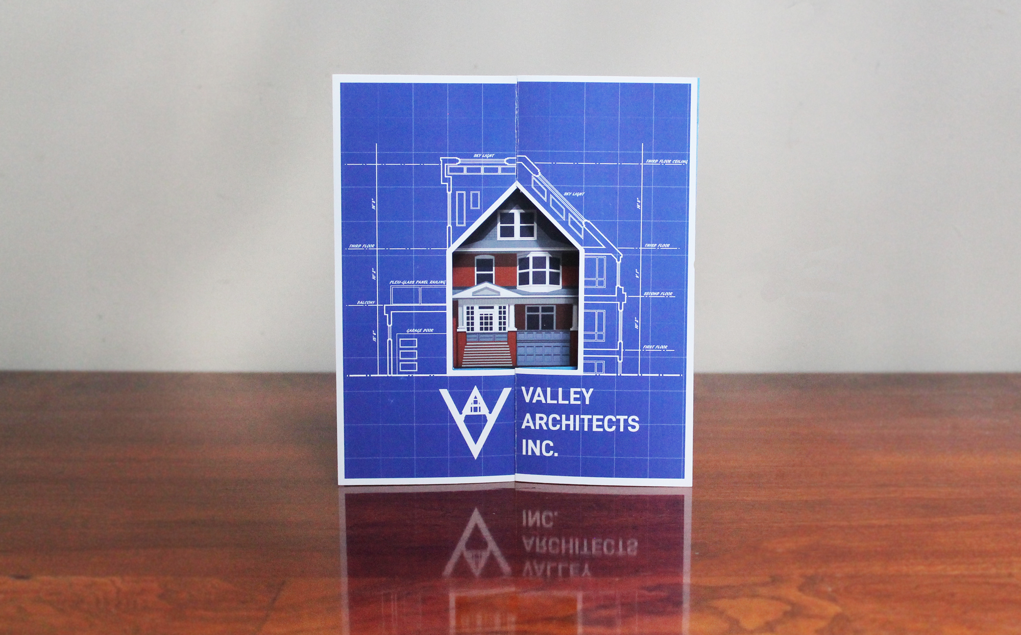 I thought the blueprints to a home addition that could open to reveal the completed structure would be a fun way to visually tell the story of the services offered by an architecture firm.