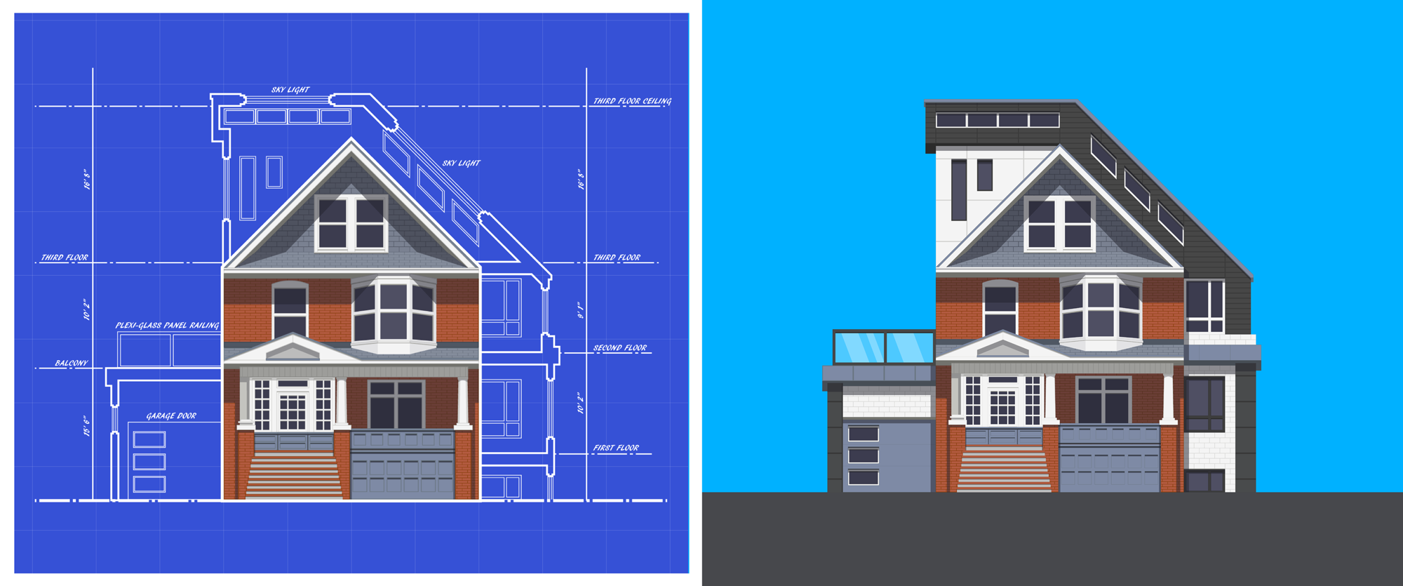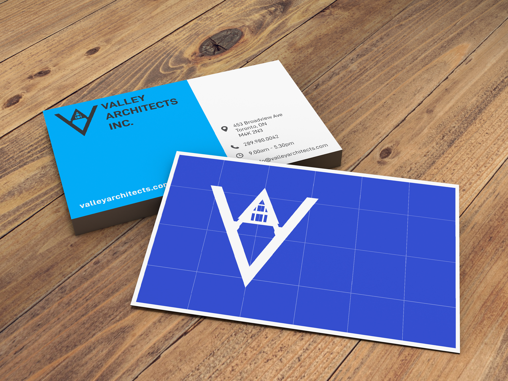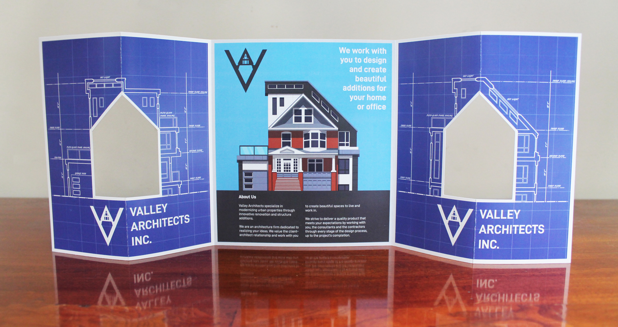 I illustrated a typical Toronto home and designed the addition with two variants. I also then created a logo for Valley Architects, and branded the ficional company with the recurring blueprint motif and a clean, minimalist design.
